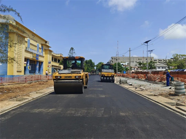 在预制场巨大的雨棚下,花砖和路缘石的生产线依旧轰鸣运转。中方管理人员沉着指挥,工人们专注操作,机器的节奏与棚外的雨声交织成一首独特的“建设交响曲”。